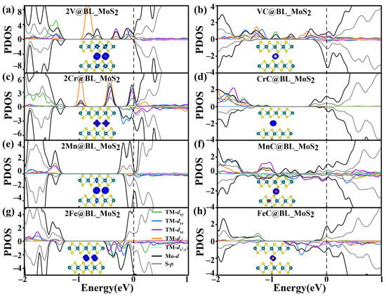 (a–d) Partial density of states (PDOS) and spin density plots for 2TM@BL_MoS2 (TM = V, Cr, Mn, Fe). (e–h) Partial density of states (PDOS) and spin density plots for TMC@BL_MoS2 (TM = V, Cr, Mn, Fe). Inside the PDOS graph is its corresponding spin density graph; blue represents positive spin, and red represents negative spin.