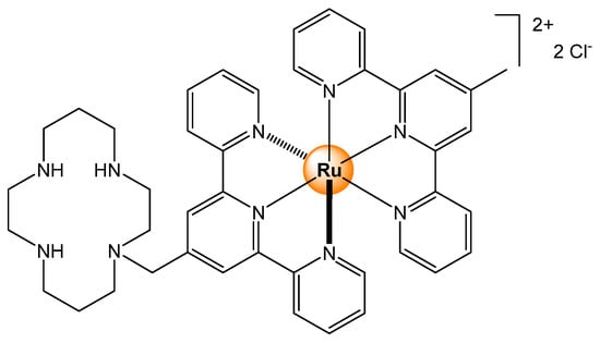 Almost 25 years ago, a bis(terpyridyl) ruthenium(II) complex was synthesized and tested as a fluorescent sensor for transition metal ions [4]. The introduction of a 1,4,8,11-tetraazacyclotetradecane macrocycle on the terpyridyl ligand has afforded a functionalized complex with a cyclic tetradentate coordinating appendage (Figure 1). Interestingly, in the presence of Ni2+, Zn2+, Cd2+, Hg2+, and Pb2+ at various pH in water/acetonitrile mixtures, no changes in the fluorescence behavior of the complex were observed. However, upon the addition of Cu2+ ions at neutral pH, a substantial quenching of the luminescent intensity of the complex was observed. The result suggests that the coordination of Cu2+ in the macrocycle triggers an energy transfer process between the two parts of the bimetallic system (Cu2+ and Ru2+), thus modifying the electronic properties of the ruthenium-based fluorophore.