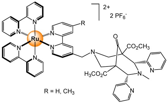 Other coordination strategies can be used to sense Hg2+, as well as other metal ions, exploiting, for example, ligands with both N∩N and N∩O chelating groups [14]. However, having chelates reduces selectivity, both being stronger ligands due to the chelating effect, unless one of the two units is coordinated to a metal prior to sensing. Indeed, when the N∩N chelating group is coordinated to a bis(bipyridyl) ruthenium unit (Figure 5), the remaining N∩O chelating site can selectively bind Cu2+ and Hg2+, which, like the previous examples, turns off the fluorescence property of the ruthenium complex through an intramolecular electron transfer photo-induced process, and accordingly, provides a visual signal for the detection of metal ions.