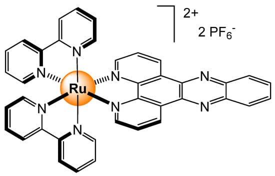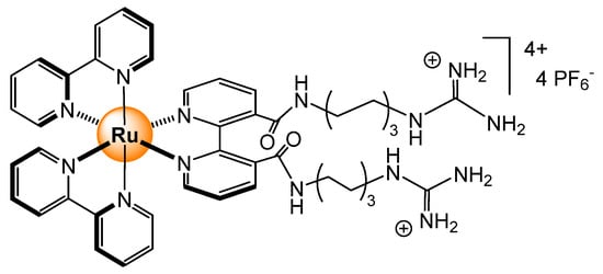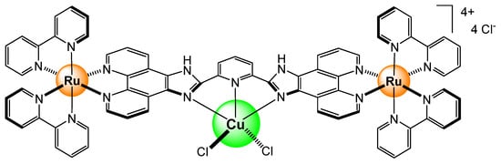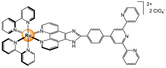 A system with two tris(bipyridyl) complexes, bridged by a bis-phenanthroline linker, has been synthesized and tested as a biological sensor for metal ions (Figure 3) [6]. The system is extremely sensitive to Cu2+ with a limit of detection of 3.33 × 10−8 M. However, in the presence of Na+, K+, Mg2+, Ca2+, Zn2+, Ag+, Fe2+, Fe3+, Ni2+, Mn2+, Co2+, Cd2+, Hg2+, and Cr3+, the luminescence intensity remains almost the same (>80%). The strong association constant (Ka ≈ 1.7 × 106 M−1) between Cu2+ and the dinuclear complex offers selectivity, and the water solubility of the system has provided an excellent probe for the detection of Cu2+ in zebrafish, taking, once again, advantage of the photophysical properties of ruthenium complexes.