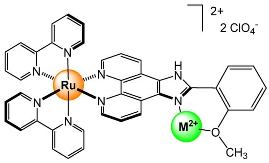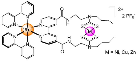 The affinity of functionalized tris(bipyridyl) ruthenium complexes for Cu2+ ions has been demonstrated on many other occasions [7,8,9]. In these systems, like those presented here, the strategy is very similar: the functionalization of one of the polypyridyl ligands on the ruthenium(II) center to be able to coordinate a cationic metal ion. Then, after coordination, the photophysical property of the polypyridyl ruthenium complex is affected, thus triggering a signal, which can be detected. However, adding selectivity and increasing affinity can only be performed upon ligand design, and too often, the ligand can coordinate different metal ions without discrimination.