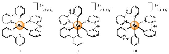 Similar interactions between anions and the N-H proton of 2,2′-dipyridylamine ligands have been observed on tris(bipyridyl) ruthenium complexes (Figure 8) [21]. Among several anions (AcO−, ClO4−, PF6−, NO3−, CN−, HSO4−, F−, Cl−, and Br−), only CN− and F− show strong interaction in acetonitrile (25 °C), with the binding constants of 104 dm3·mol−1 for the mono-substituted derivative (Figure 8I), 1010 dm6·mol−2 for the di-substituted (Figure 8II), and 1014 dm9 · mol−3 for the tris-2,2′-dipyridylamine ruthenium complex (Figure 8III). The naked-eye detection of anions occurs by deprotonation of the N-H groups, as demonstrated by a combination of 1H NMR, electrochemistry, and emission spectroscopy studies.