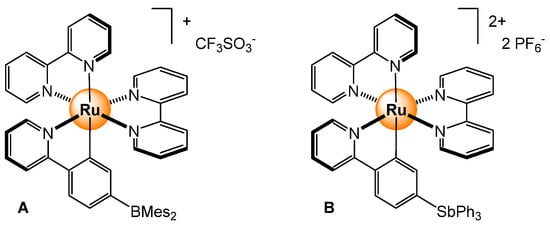 Cationic cyclometalated ruthenium complexes with a Lewis acid appendage at the periphery for anion sensing have been synthesized and characterized [22,23]. For the boryl derivative (Figure 9A), in the presence of F− and CN−, the corresponding zwitterionic fluoroborate and cyanoborate species are formed, with the binding constants (9/1 THF/DMF mixture) of 8.0 × 106 M−1 for fluoride and >107 M−1 for cyanide, respectively [22]. The antimony analog (Figure 9B) shows in acetonitrile with slightly weaker binding constants, being 6.8 × 105 M−1 for CN− and 1.4 × 106 M−1 for F− [23]. In both systems, the coordination of an anion on the Lewis acid moiety modifies the photophysical and electrochemical properties of the ruthenium polypyridyl complex, which is used to sense the presence of small anions in a solution.