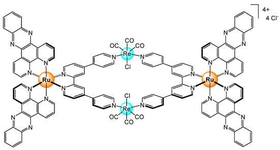 Coordination-driven self-assembly was used to develop luminescence hosts for the selective sensing of ATP in water [32]. The water-soluble hetero-bimetallic assemblies were built from two ruthenium bis-dipyridylphenazine units and two rhenium chloro triscarbonyl metal centers linked by two tetrapyridyl connectors (Figure 13). This particular host shows a specific emission response to ATP, while with the structurally analog GTP (guanosine triphosphate), no such emission behavior was observed. Computational studies suggest a different host-guest binding geometry, thus modulating the host-guest stacking interactions, and ultimately, modifying the luminescence response of the ruthenium(II) sensor.