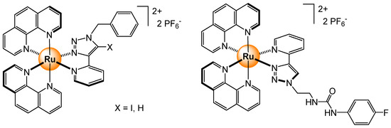 Other functional groups can be inserted at the periphery of polypyridyl ruthenium complexes. For example, ruthenium(II) complexes incorporating two phenanthrolines and a triazolo-pyridyl functionalized ligand have been designed for anion sensing [35,36]. The iodo derivative (Figure 15, left) interacts strongly with H2PO4− through halogen-bond interactions, with an association constant of 1.94 × 105 M−1 (CH3CN solution) [35]. Similarly, the 4-fluorophenyl urea functionalized complex (Figure 15, right) selectively sensed phosphates (H2PO4− and HP2O73−) in the presence of competitive anions (AcO−, ClO4−, PhCO2−, NO3−, HSO4−, CO32−, F−, Cl−, Br−, or I−) [36]. Interestingly, a titration of dihydrogen phosphate with the ruthenium complex showed a two-site binding system, while with hydrogen pyrophosphate a single 1:1 binding system was observed.