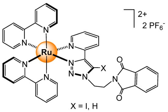 Analogous complexes, with two bipyridyls and a triazolo-pyridyl functionalized ligand with an iodo group, have also been used to sense phosphates [37]. In these systems, a phthalimide group was anchored to the triazolo-pyridyl unit (Figure 16). Like its predecessors, the binding affinity for H2PO4− and HP2O73− was excellent, with a limit of detection being in the nanomolar range (CH3CN solution). The presence of an iodo group was demonstrated to be crucial for increasing the selectivity for phosphates via halogen–anion interactions.