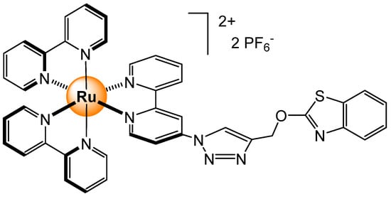 A tris(bipyridyl) ruthenium(II) complex, in which a triazolo group is coupled with a benzothiazole, is part of the functionalization of a bi-pyridyl ligand (Figure 17), which was used for sensing phosphate anions [38]. The binding constants in acetonitrile for H2PO4− and H2P2O72− were estimated to be 7.7 × 104 mol−1 and 4.4 × 104 mol−1, respectively. The luminescence-enhancing phenomena in the presence of phosphates were exploited for cancer cell imaging. After 24 h of incubation, the ruthenium complex (50 μM) was internalized, showing strong red fluorescence in MCF-7 cancer cells. Interestingly, the fluorescence was quenched by adding four equivalents of Cu2+ ions to the cellular supernatant, thus suggesting that this fluorescence response can be used to evaluate levels of Cu2+ in cells.