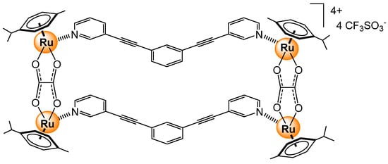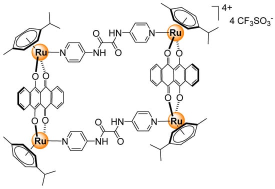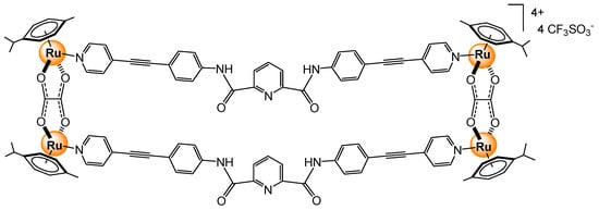 Following the same strategy, other arene ruthenium metalla-rectangles were synthesized, and their ability to sense carboxylate anions was evaluated [43,44]. In all the cases, the donor groups were located on a bipyridyl linker. They consist of amido derivatives with different flexibility and geometry. In the case of 2,6-bis{N-(4-pyridyl)carbamoyl}pyridine, a bowl-shaped structure was obtained in which oxalate, tartrate, and citrate could sit and interact with NH-amido groups (Ka > 104 M−1 in methanol) [43]. On the other hand, with the unsymmetrical linker N-{4-(pyridin-4-ylethynyl)phenyl}isonicotinamide, a distorted rectangular geometry of the assembly was obtained, thus having isomeric mixtures [44]. Nevertheless, the metalla-rectangle showed a similar affinity for multi-carboxylate anions in solution thanks to the flexibility of the linkers. The binding constant for tartrate in methanol was estimated to be 5.5 × 104 M−1.