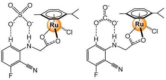 Mononuclear arene ruthenium complexes were also used for sensing carboxylate anions [46]. Once again, the ruthenium complexes possess functional groups that allow the formation of hydrogen-bonded adducts between a functionalized ligand of the ruthenium complex and anions. Carbonate showed the strongest binding affinity (Ka = 3.97 × 104 M−1 in DMSO), followed by sulfate (Ka = 2.59 × 104 M−1). The geometry and double negative charge of these anions appear to be ideal for forming adducts (Figure 20), while all the other ions (SCN−, N3−, BPh4−, NO2−, S2O82−, Cl−, Br−, I−, Mg2+, K+, Ca2+, Sr2+, Hg2+, Cu2+, Fe3+, Mn2+, Zn2+, NH4+, Ni2+, Ba2+, Al3+, and Cd2+) have shown no specific interaction that could be detected by spectroscopic methods.