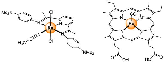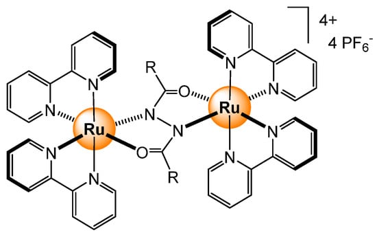 Redox-active dinuclear ruthenium-based complexes (Figure 21) have been prepared using 1,2-dicarbonylhydrazido bridging ligands [53]. The dinuclear complex can be oxidized, thus switching on near-infrared (NIR) absorption. Under the right conditions, the response was particularly strong when the diruthenium complex reacted with hydrogen peroxide and glucose under physiological conditions (acetonitrile/Tris buffer).