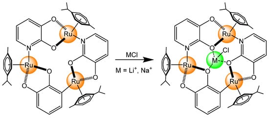 Regarding alkali metals interacting with arene ruthenium-based complexes, the first example came from the group of Severin [15]. Trinuclear arene ruthenium metallacycles were prepared to mimic the cavity of crown ethers, thus allowing small ions to interact with the three perfectly positioned oxygen atoms of the bowl-shaped cavity (Scheme 1). In these systems, the selectivity for Li+ over Na+ was achieved by steric constraints from the arene ligands (p-cymene, toluene, triethylbenzene, hexamethylbenzene), which were located at the periphery of the cavity. The stability constant for these host–guest systems was quite high (>105 L·mol−1 in CD3OD for LiCl), but also very dependent on the solvent used. Interestingly, when the host cavity is occupied by a guest, the trinuclear complex is protected from oxidation. However, in the absence of LiCl or NaCl in the cavity of the host, a solution containing the trinuclear arene ruthenium metallacycle upon the addition of the oxidizing agent 2,3-dichloro-5,6-dicyano-1,4-benzoquinone (DDQ) will show a distinct color change, from yellow to orange–red. This color change is due to the oxidation of the ruthenium complex, which is extremely fast for the free receptor, and slow when occupied.