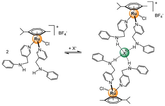 Arene ruthenium complexes were also used to sense small anions (AcO−, H2PO4−, HSO4−, CF3SO3−, NO3−, Cl−, and Br−) [17]. The presence of amino groups on the pyridine-based ligands can interact with small anions in a 1:1 or 1:2 ratio. Under a 1:2 ratio (anion–complex), the anion is surrounded by two arene ruthenium complexes, forming four weak N-H…anion interactions (Scheme 2). In such an environment, the ligand-to-metal charge transfer which takes place in the free complex is disrupted, thus modifying the fluorescence spectrum. Similarly, upon the addition of anions, some 1H NMR signals become diastereotopic, providing another spectroscopic method to study the host-guest systems, and if desired, to allow the determination of binding constants.