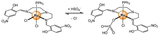The anion exchanged capability of an inorganic [RuCl2(PPh3)L] (L = N,N-bis(2-hydroxy-5-nitrobenzaldehyde)-2,2′-diaminodiethylamine) complex has been used to sense small anions [24]. In the presence of bisulfate, a strong enhancement of the fluorescence (λex = 310 nm, λem = 347 nm) was observed, which was attributed to the replacement of one coordinated chloride with a bisulfate anion (Scheme 3). The binding constant was estimated at 2.3 × 105 M−1 (8/2 H2O/CH3CN mixture). The fluorescence remains high in the presence of an excess of other anions (AcO−, ClO4−, PF6−, NO3−, CN−, H2PO4−, S2O32−, F−, Cl−, Br−, or I−), showing a specificity for the bisulfate anion.