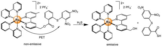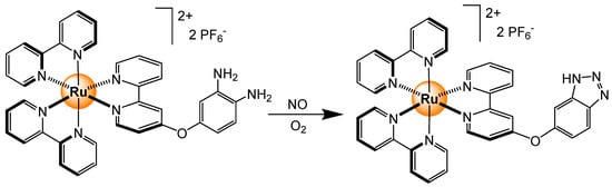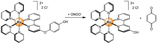 Among the other small anions, peroxynitrite (ONOO−) is also a biologically relevant anion [47]. Peroxynitrite is a reactive biological oxidant which is involved in multiple biological processes where it acts as a peroxide, Lewis base, or free radical generator. However, because it is a short-lived and very reactive oxidant, sensing peroxynitrite remains a challenge. Nevertheless, a ruthenium-based polypyridyl complex was used to sense ONOO− in a methanol/water mixture [48]. In the presence of peroxynitrite, the functionalized bipyridyl ligand was oxidized, thus generating 1,4-benzoquinone (Scheme 4). The dealkylation reaction quenched the fluorescence signal of the complex, a phenomenon that was not observed with other ROS/RNS species (·OH, O2−, NO3−, NO2−, H2O2, 1O2, ·O2−, and NO). The probe was water soluble and showed a good response in the range of 10–50 μM at physiological pH.