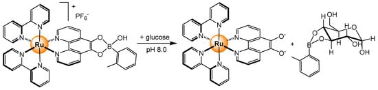 The development of boronic acid-based sensors for carbohydrates remains one of the most popular strategies to detect sugars [49]. Boronic acids can reversibly bind diols, a ubiquitous feature of sugars, and therefore, boronic acid functions are often introduced in the molecular sensors of carbohydrates. Consequently, it is not surprising that the first ruthenium-based sensor for glucose has taken advantage of that property [50,51]. The bis-bipyridyl 5,6-dyhydroxy-1,10-phenanthroline ruthenium complex forms at pH 8 a boronic acid adduct, which in the presence of glucose is broken up (Scheme 5). In this displacement assay, the luminescent intensity of the ruthenium boronic acid complex is extremely high, but it decreases gradually in the presence of glucose. An analogous ruthenium-based probe has been developed to sense glucose by the luminescence decay of a long-lifetime ruthenium tris(bipyridyl) complex [52]. The ruthenium center was coupled with Concanavalin A, a mannose residue binder, and the system was based on competitive displacement in the presence of glucose, once again, taking advantage of the disruption of the MLCT energy transfer process at the ruthenium center.