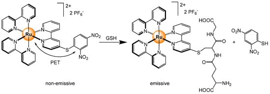 - Liu, C.; Liu, J.; Zhang, W.; Wang, Y.-L.; Liu, Q.; Song, B.; Yuan, J.; Zhang, R. “Two birds with one stone” ruthenium(II) complex probe for biothiols discrimination and detection in vitro and in vivo. Adv. Sci. 2020, 7, 2000458. [Google Scholar] [CrossRef] [PubMed]