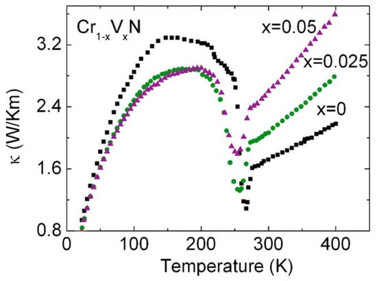 The sample shows a kink at the transition temperature in Seebeck versus temperature, thermoelectric power factor versus temperature, and thermal conductivity versus temperature data [78]. The thermal conductivity versus temperature data of Cr1−xVxN are shown in Figure 2. Regarding the change in the heat conduction mechanism due to the latent heat involvement in the phase transition, the thermal conductivity shows a cusp at 286 K. In the scope of this paper, the interest is in the x = 0 curve, which represents the stoichiometric CrN sample. The other vanadium doped CrN samples also show the cusp, which indicates that the structural transition strongly alters the heat transport mechanism even in Cr1−xVxN samples. The broad maximum observed at around 150 K, which is related to phonons at a low-temperature propagation of phonons, is limited by the grain size. A more detailed discussion of the phonon peaks is provided by Ebad-Allah et al. [81]. Vanadium incorporation in CrN reduces the thermal conductivity at around 150 K, but the cusp temperature remains almost unchanged.