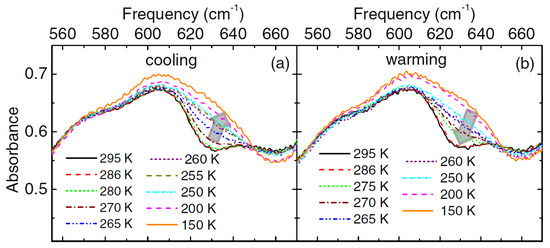 Absorbance of a CrN pellet as a function of temperature for (a) cooling and (b) warming parts of cycles. The arrows highlight changes in the data acquired while cooling and warming the samples [81].