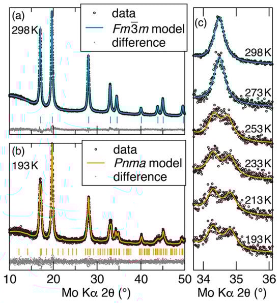 The VT-XRD data of the nanoparticles annealed at 873 K and Rietveld refinement simulated data are shown in Figure 4. The data shown in Figure 4a were acquired at 298 K and show a cubic crystal structure of the space group Fmm; and the data in Figure 4b were acquired at 193 K and show an orthorhombic crystal structure of the space group Pnma. These indicate that the samples went through a structural transition between 298 K and 193 K. The main difference is that the 222 peak (2θ = 34.49° produced by the cubic symmetry was split into three peaks—022, 402, and 122—related to the orthorhombic symmetry. Scanning the 022, 402, and 122 peaks in steps of 20 K while warming the sample from 193 K to 298 K revealed the transition temperature between 253 and 273 K.