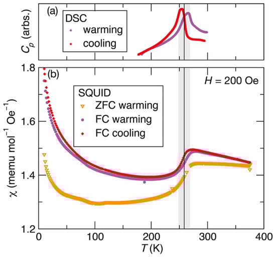 Furthermore, Zieschang et al. studied transition in heat capacity and magnetic transition as a function of temperature by differential scanning calorimetry and magnetic susceptibility by SQUID as shown in Figure 5. In Figure 5a, the data recorded for the cooling and warming cycles show a transition in the heat capacity at around 259 K, which indicates that the transition is reversible and reproducible. Similarly, the magnetic susceptibility-versus-temperature data in Figure 5b reveal magnetic phase transition from the paramagnetic to the antiferromagnetic phase between 248 and 269 K, which matches the structural and heat capacity transition. The observation of all these transitions in CrN particles at about the same temperature strengthens the earlier theoretical and experimental claims that these transitions are coupled [58,68].