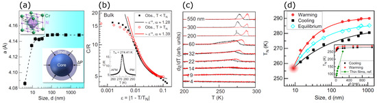 A meticulous study of the finite-size effect on the magnetic and structural transitions in CrN nanoparticles was reported by Wang et al. [92]. They synthesized CrN nanoparticles by mixing anhydrous CrCl3 of 99.5% purity and NaNH2 of 99.5% purity in a 1:4 ratio. The mixture was compressed into a cylindrical shape 10 mm in diameter and height in argon ambient. The samples were then encapsulated into a molybdenum capsule and loaded into a high-pressure cell. For controlling the nanoparticles’ size, the cell was first exposed to a different target pressure between 1 and 5 GPa, followed by heating to a different temperature between 573 and 1773 K for 20 min, before quenching and decompressing the cell to atmospheric pressure. The nanoparticles thus prepared were washed with distilled water. The average diameter of the nanoparticles synthesized under different conditions was in a range of 4 nm to 2750 nm. The lattice constant determined by XRD is provided in Figure 6a. The lattice sharply increases from 4.086 Å to 4.418 Å for nanoparticle diameters of 4 nm and 100 nm, respectively, and it shows a plateau for all nanoparticle diameters larger than 100 nm, which matches the reported values in [68,69,80,93]. It shows that smaller particles have a larger stress compared to larger ones. Figure 6b shows heat capacity versus reduced temperature , where T is the samples’ temperature. Heat capacity manifests discontinuity across TN and shows a peak at 274.41 K for the bulk samples, which is related to the spin reordering in the magnetic phase transition from the paramagnetic to the antiferromagnetic phase. The critical behaviors of heat capacity can be explored by fitting the data by a power law of , with values of 1.39 and 1.28 for the paramagnetic and antiferromagnetic phases, which are larger than any conventional universality classes with values of less than 0.25, which leads to a conclusion that the spins were reordered by the lattice due to its spin–lattice coupling [58,94]. In Figure 6c, the temperature derivative of dc susceptibility (dχ/dT) as a function of temperature shows peaks associated with the magnetic transition in both the cooling and warming data. The peaks can be observed in particles of size 550 nm to 9 nm, but below 9 nm, the transition vanishes due to a small size effect [92]. The Neel temperature as a function of the particle size is illustrated in Figure 6d, where TN for 9 nm particles is about 256 K and for the 1000 nm particle, it is 285 K, which matches the values reported by [68,70].