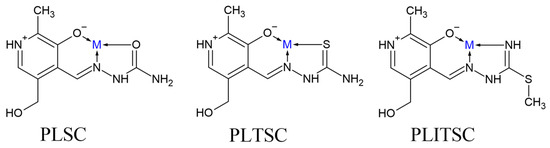 Complexes containing semi- and thiosemicarbazone ligands have attracted the attention of scientists due to their interesting structural characteristics and the possibility of complexation to different transition metals [12]. The biological activity of these compounds includes potential use as radioprotectors, anti-protozoa agents, chelating ligands, and antimicrobials [13]. The thiosemicarbazone complexes have shown a broader spectrum of biological activities, as discussed in [14]. Thiosemicarbazones (R1R2C2=N3-N2(H)-C1(=S)N1R3R4) are a diverse group of ligands containing both nitrogen and sulfur donor atoms. They are prepared via condensation between ketone or aldehyde and thiosemicarbazide. Depending on protonation, these ligands form differently charged complexes [15]. Pyridoxal–thiosemicarbazone (PLTSC) is formed by reacting pyrodixal, a vitamin B6 analog, and thiosemicarbazone [12]. A comprehensive review of the transition metal complexes with PLTSC is presented in [13]. The pyridoxal–semicarazone (PLSC) ligand is an oxygen analog of PLTSC, with ONO donor atoms [12]. The third ligand of interest for this study is pyridoxal-S-methylisothiosemicarbazone (PLITSC), formed in the reaction between pyridoxal and S-methyl-isothiosemicarbazone. In this ligand, the sulfur atom is protected by the presence of a methyl substituent, which leads to an ONN donor system. PLITSC can also be found in neutral, mono, and dianionic forms [16]. The structures of neutral PLSC, PLTSC, and PLITSC ligands are presented in Figure 1.