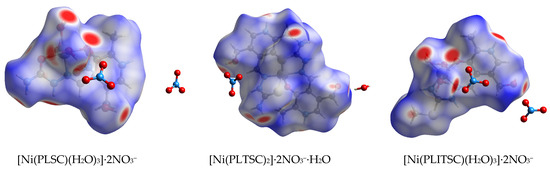 Selected crystal structures of nickel(II) nitrate complexes with PLSC, PLTSC, and PLITSC were examined using Hirshfeld surface analysis. These three structures were chosen because all contain nickel in +2 state, a ligand in a neutral form, a charge of the complex cation of +2, and surrounding nitrate counterions. Therefore, these structures allow for the elucidation of the most important contacts in the crystal structures, as three ligands differ in the donor atoms attached to central metal ion. Figure 2 presents the Hirshfeld surfaces of these complex compounds, while the most important contacts are listed in Table 1. The fingerprint plots of the most numerous contacts are given in Figures S1–S3. It is important to outline that only the complex cation was included when examining the stabilization interactions, as the positions of nitrate counterions are significantly different in the examined structures.