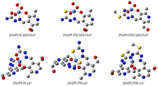 The structures of three experimental and three theoretical structures were optimized at the B3LYP/6-311++G(d,p)(H,C,N,O,(S))/LanL2DZ(Ni) level of theory, as shown in Figure 3. The triplet state of the complexes was considered, as it was shown to be more stable than the singlet one [26]. The applicability of the selected level of theory was examined by comparing the crystallographic and optimized bond lengths and angles for ([Ni(PLSC)(H2O)3]2+, [Ni(PLITSC)(H2O)3]2+, and [Ni(PLTSC)2]2+ complex cations. These structures were extracted from previously discussed crystal structures. The quantitative parameters used for comparison were the correlation coefficient and mean absolute error (MAE). The second parameter calculates the average absolute difference between the two datasets. The experimental and theoretical structural parameters are listed in Tables S1–S3, while the R and MAE values are presented in Table 2. The optimization of theoretical structures was needed to further analyze the coordination of ligands to the central metal ions, as well as for the molecular docking simulations of the binding to transport proteins and DNA.