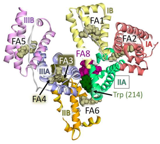 Structure of HSA with subdomains: IA in reddish, IB in yellow, IIA in green, IIB in orange, IIIA in lilac, and IIIB in pink. The active positions FA1–FA8 are denoted with the representation of myristic acids (yellow CPK model), commonly bound in the structures. The position of a fluorescent amino acid, Trp214, is depicted as dark green CPK balls, while [Ni(PLSC)2]2+ is presented as purple CPK balls.