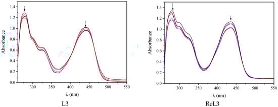 | L3 | 277 (−7, +2); 325 (sh) (−7, 0); 441 (−6, 0) | 7.01 (±0.01) × 104 |