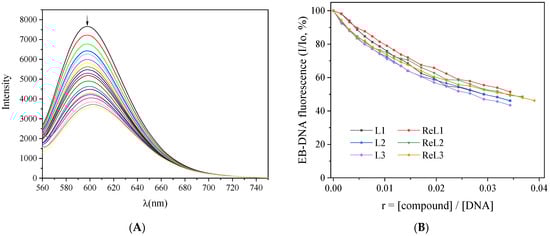 3.4.3. Competition Studies with Ethidium Bromide (EB) via Fluorescence Spectroscopy