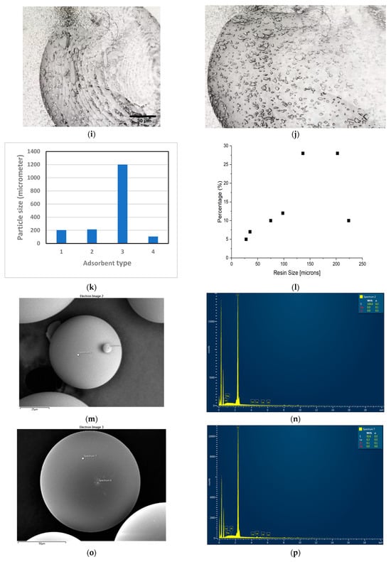 Figure 1k, this resin’s particles are smaller than those of the others, except Amberchrom 50WX2; thereby, the total surface area per unit mass would be relatively higher, enhancing adsorption capacity and adsorption rate, as shown in