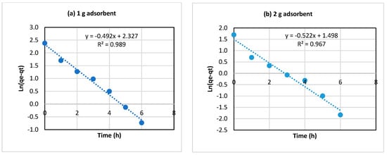 With the integration of Equation (1) and the rearrangement of the resultant equation, the pseudo-first-order kinetic equation can be rewritten as follows: