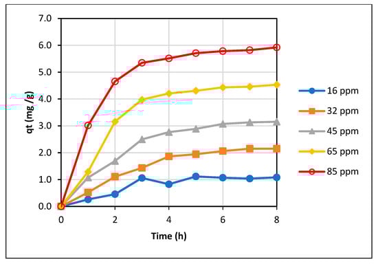 The variation of the adsorbed amount of La(III) with adsorption time for varied initial La(III) concentrations was calculated and is plotted in
