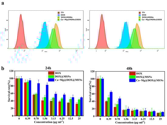 4T1 cells were inoculated into six-well plates (5 × 105/well) and incubated overnight at 37 °C, 5% CO2, and suitable humidity. DOX, DOX@MSNs, and Ca-Mg@DOX@MSNs (DOX content 1 ug/mL) were added, respectively, along with a blank control, and, after 2 h and 24 h of action, the cells were washed three times with PBS, digested, centrifuged at 1000 r/min, and resuspended with PBS. Sieving was performed, flow cytometry (LSR-II, BD, USA) was performed, and FlowJo analyzed the data [67].