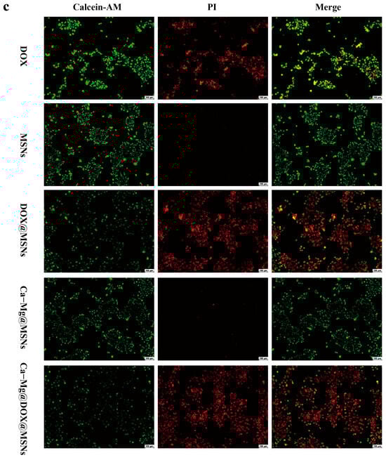 The effects of DOX@MSNs and Ca-Mg@DOX@MSNs on 4T1 cells were observed by the laser confocal staining of live and dead cells. Calcein-AM can pass through the intact cell membrane and embed in the nuclei of all cells (live and dead), showing green fluorescence. PI can only pass through the incomplete cell membrane of the dead cells and be embedded in the nuclei of all dead cells. The nuclei of all dead cells show red fluorescence. From the experimental results, we can see that the red fluorescence in the nuclei of 4T1 cells after the action of DOX@MSNs and Ca-Mg@DOX@MSNs was significantly higher than that of MSNs and Ca-Mg@MSN groups, which indicated that the dead cells were increased by loading DOX. The results were in agreement with the results of CCK-8 (Figure 5c).
