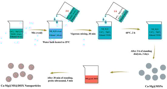 After mixing 20 mL of concentrated ammonia and 200 mL of ethanol and heating the water bath to a temperature of 35 °C, a certain amount of CaCl2 and MgCl2 (specifically, the dosage forms were prepared under Ca2+:Mg2+ = 1:1 conditions with 1.25%, 2.5%, and 5% CaCl2 and MgCl2 concentration gradients, respectively), 10 mL of TEOS, and 100 mL of ethanol were mixed homogeneously, and 3/4 of the TEOS ethanol solution was taken and added dropwise to the ammonia–ethanol mixed solution. Stir vigorously for 30 min; add the remaining 1/4 of TEOS solution dropwise; and react for 2 h at a temperature of 60 °C. After the system was cooled down to room temperature and left to age for 3 h, the mixture was poured into a treated dialysis bag with a cut-off relative molecular mass of 8000–14,000 kDa. The bag was submerged in deionized water for dialysis for 3 d. During this period, the water was changed every 6 h, and, after the end of dialysis, the resulting samples were freeze-dried and stored at −20 °C [55].