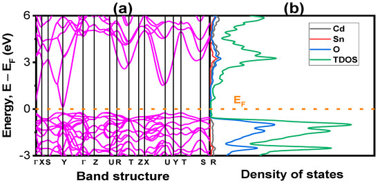 The electronic properties of cadmium-tin-oxide showing (a) the band structure and (b) the density of states.
