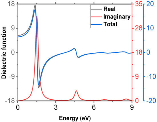 A material’s optical properties can be inferred from its dielectric function (which is linked to its electrical structure). It is especially crucial for comprehending how materials respond to light [29]. The dielectric function, depicted in Figure 3, has many peaks associated with band-to-band transitions. The figures show that the imaginary part of the dielectric constant has a peak at and an energy of 1.5 eV and then dies off thereafter, which is in contrast to the result reported by Tang et al. [16], which showed a general increase with the increase in the energy. The disparity between the two curves can be attributed to the different computational methods employed. Tang et al. used PAW pseudopotentials within the VASP package, while this study used PBE pseudopotentials within the Quantum Espresso package (version 6.4.1). As energy increases, the dielectric function’s peaks disappear, and this is a characteristic feature observed in many materials, which is often associated with electronic transitions within the material. The effect of the disappearance of the peak of the dielectric function with energy is responsible for the phenomenon whereby higher energy levels are involved in transitions that may become likely or occur less frequently with the increase in the energy of the incoming light. Furthermore, the energy of the scattered or absorbed photon must equal the energy needed for the electronic transition due to the principle of conservation of energy. At higher energies, there may be fewer electronic states available for absorption, leading to a reduction in the intensity of absorption peaks, which is evident in Figure 3 at frequencies above 5 eV. Materials often exhibit multiple electronic processes contributing to the dielectric function. At higher energies, additional electronic processes may come into play, leading to the redistribution of the overall spectral intensity. The effect can also be brought about by the bandwidth effects. At higher energies, electronic transitions tend to have broader bandwidths, resulting in peaks that are less sharp and more spread-out [30].