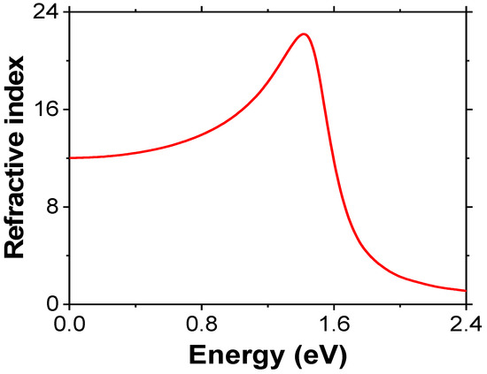 The refractive index indicates how light travels through a material. It is critical in the design of optical components such as lenses, prisms, and fibers [34,35]. In Figure 4, it can be observed that the refractive index decreases as the energy increases. This is a common phenomenon in many materials, especially the transparent ones, where the refractive index is wavelength-dependent, and has also been observed in previous studies [6,22]. The behavior is known as normal or positive dispersion, and it can be brought about by a number of factors, including electronic resonances, energy level transitions, and material absorption bands. At higher energies of ultraviolet and beyond, the electronic resonances and transitions within the material may result in a decrease in the refractive index, which is often observed as the material absorbs more light in these higher energy ranges. Electronic transitions associated with higher energy levels can lead to a rise in the absorption of light, which, in effect, reduces the effective speed of light within the material, resulting in a lower refractive index.