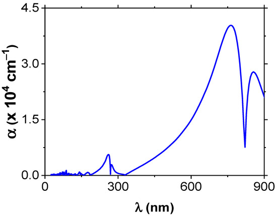 Figure 5 depicts the variation of the absorption coefficient with the wavelength, which indicates an increase as the wavelength increases. This is in contrast to the result reported by Tang et al. [16], which shows a decrease, and the disparity between the two can be attributed to the different computational methods employed. Materials’ electronic structures and the types of transitions that result in absorption dictate the relationship between the optical absorption coefficient and wavelength. The type of bandgap and the density of states are the two common causes of this behavior, though it can also vary based on the particular properties of the material [38].