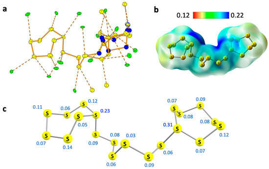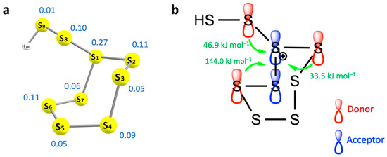In the valence bond structures, the positive formal charge is localized on the three-coordinated sulfur atom S1 [46] and on the atom S6, respectively. To obtain a deeper understanding of structure and bonding, we quantum chemically calculated the structure of the branched [cyclo-S7–SSH]+ cation. The substituent –SSH mimics the chain of sulfur atoms in the structure of [S20]2+ when capped after two sulfur atoms. These DFT calculations reveal the positive charge in [cyclo-S7–SSH]+ to be delocalized over the entire cation, but the highest positive charge is still located on atoms S1 and S6 (see Figure 6a and Figure S7 in the Supplementary Material).