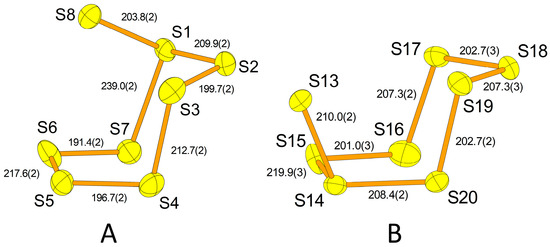 The structure of the [S20]2+ cation is strongly related to the known crystal structures of [S19]2+ and [Se17]2+ (Figure 2) [14,17,36,37]. Obviously, all three dications consisting of seven-membered rings bridged by a chain of variable length belong to the same class of homopolyatomic chalcogen cations. Figure 5 visualizes the two independent seven-membered sulfur homocycles in the [S20]2+ dication. For the disordered ring, only the major component is shown. Both seven-membered rings occupy a chair conformation but, when arranged in the same way (Figure 5), it becomes obvious that the substitution pattern is different. In the ordered part of the molecule (atoms S1–S7), the sulfur chain is attached to atom S1 (conformation A, left in Figure 5), while in the disordered part (atoms S14–S20 for the main component), the sulfur chain is bonded to an atom of the planar four-membered part of the homocycle (conformation B, right in Figure 5).