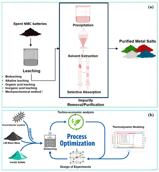 Figure 5 illustrates the key biochemical mechanisms involved in the removal of metals from spent lithium-ion batteries (LIBs) through bioleaching [78]. The process is based on the interactions between microbes and the LIB particles, which lead to various biochemical reactions that promote metal leaching. Sulfate-reducing bacteria (SRB) can reduce sulfate to hydrogen sulfide (H2S), which then reacts with metal ions (e.g., Fe3+) to form soluble metal sulfides, thereby enhancing metal dissolution. Iron-oxidizing bacteria, such as A. ferrooxidans, can oxidize Fe2+ to Fe3+, a strong oxidant that accelerates metal leaching. Fungi, like A. niger, produce complexolysis agents, such as citric, oxalic, and gluconic acids, which form soluble complexes with metal ions and promote their leaching. Additionally, microorganisms can produce organic ligands (e.g., siderophores) and inorganic ligands (e.g., ferricyanide ions) that form soluble metal–organic/inorganic complexes, further enhancing metal leaching. The synergistic effect of these biochemical processes improves the ability of microorganisms to leach metals from spent LIBs, making bioleaching an efficient and eco-friendly metal recovery technique.