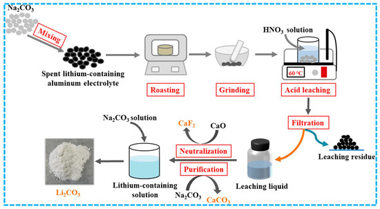 Flowchart of the recycling process for recovering lithium from spent lithium-containing aluminum electrolyte [67].