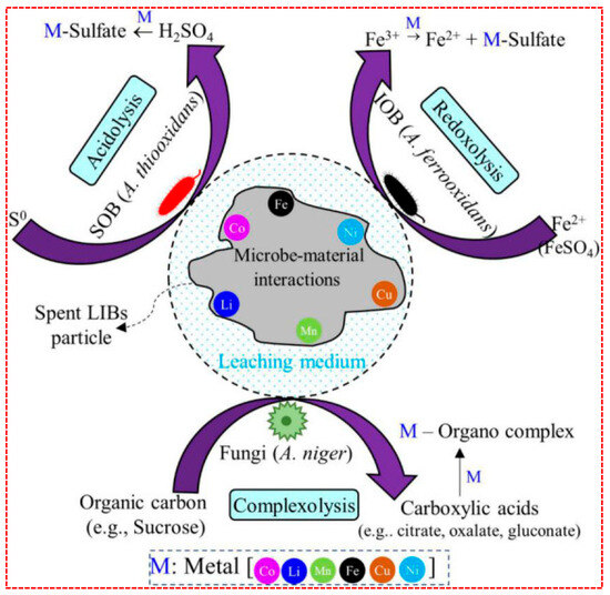 Key biochemical mechanisms for the removal of metals from spent LIBs [78].