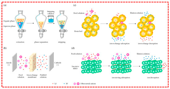 Adsorption-based methods, including ion exchange, ion-sieving, and other adsorption techniques, have shown promising prospects for lithium purification from various aqueous resources. These methods rely on the selective interaction between lithium ions and the adsorbent materials