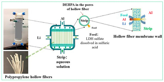 Wagh et al. [87] developed a membrane solvent extraction (MSX) process by coupling solvent extraction with membrane separation using Di(2-ethylhexyl)phosphate (D2EHPA) as the carrier for the separation and purification of lithium from clay mineral leachate. As illustrated in Figure 7, the MSX system consists of a hollow fiber membrane module with D2EHPA impregnated in the pores of the hollow fibers. The process first involves the adsorption of Li+ from the leachate using Al(OH)3 to form a lithium aluminum double-hydroxide sulfate (LDH sulfate) precipitate, which is then dissolved in dilute sulfuric acid to prepare a lithium-containing feed solution. The feed solution is circulated through the shell side of the hollow fiber module, while the stripping solution (2 mol/L H2SO4) flows countercurrently through the lumen side. Under optimized conditions (pH = 3, 30% D2EHPA/isopar as the organic phase in the membrane pores), the MSX process achieved a lithium recovery of 92% with a purity of ≥94%. Compared with traditional extraction processes, the MSX process offers advantages such as fast mass transfer rates and low energy consumption, showing great potential for applications in lithium-ion batteries and clean energy fields.