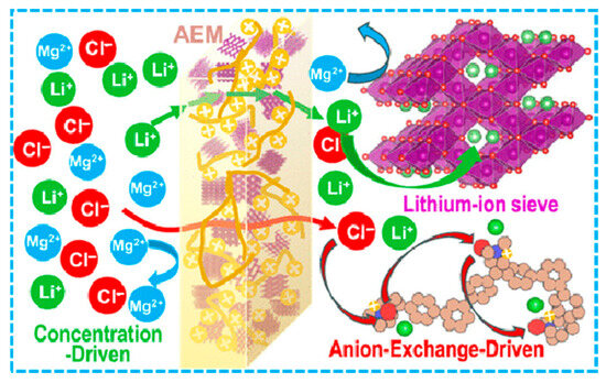 Schematic illustration of the Li+/Mg2+ separation mechanism in the anion-exchange- and cation-concentration-driven hybrid membrane incorporating a lithium-ion sieve (HMO) [102].