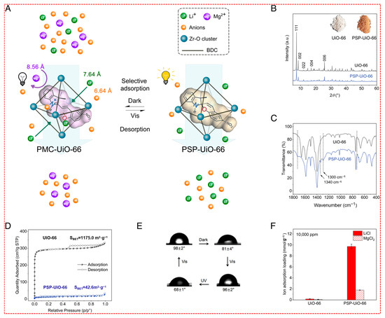 Sieving adsorption of lithium in PSP-UiO-66. (A) Schematic illustration of the mechanism of selective lithium salt adsorption by PSP-UiO-66 in the dark and desorption under sunlight irradiation. (B) XRD patterns of UiO-66 and PSP-UiO-66. The inset of B is the optical image of UiO-66 and PSP-UiO-66. (C) FT-IR spectra of UiO-66 and PSP-UiO-66. (D) N2 adsorption–desorption isotherms of UiO-66 and PSP-UiO-66. (E) The cyclic water contact angles of PSP-UiO-66 measured under dark, Vis, and UV light conditions. (F) Ion adsorption loading of UiO-66 and PSP-UiO-66 tested in 10,000 ppm LiCl and MgCl2 solutions. The error bars indicate SD.